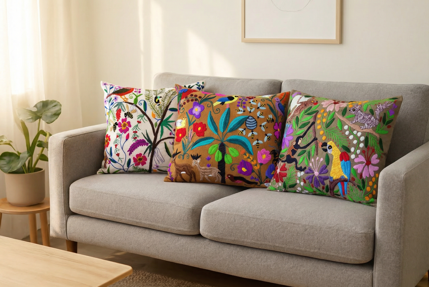 Otomi-Kissenbezüge verwandeln jeden Raum in etwas Besonderes. Die kunstvoll bestickten Bezüge aus Mexiko bringen Farbe, Tradition und Lebendigkeit in Ihre Wohnung – ob auf dem Sofa, im Schlafzimmer oder als Akzent im Lesesessel.