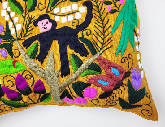 Besticktes und gewebtes Kissen aus Mexiko, Kissenhülle mit Tiermuster aus Mexiko