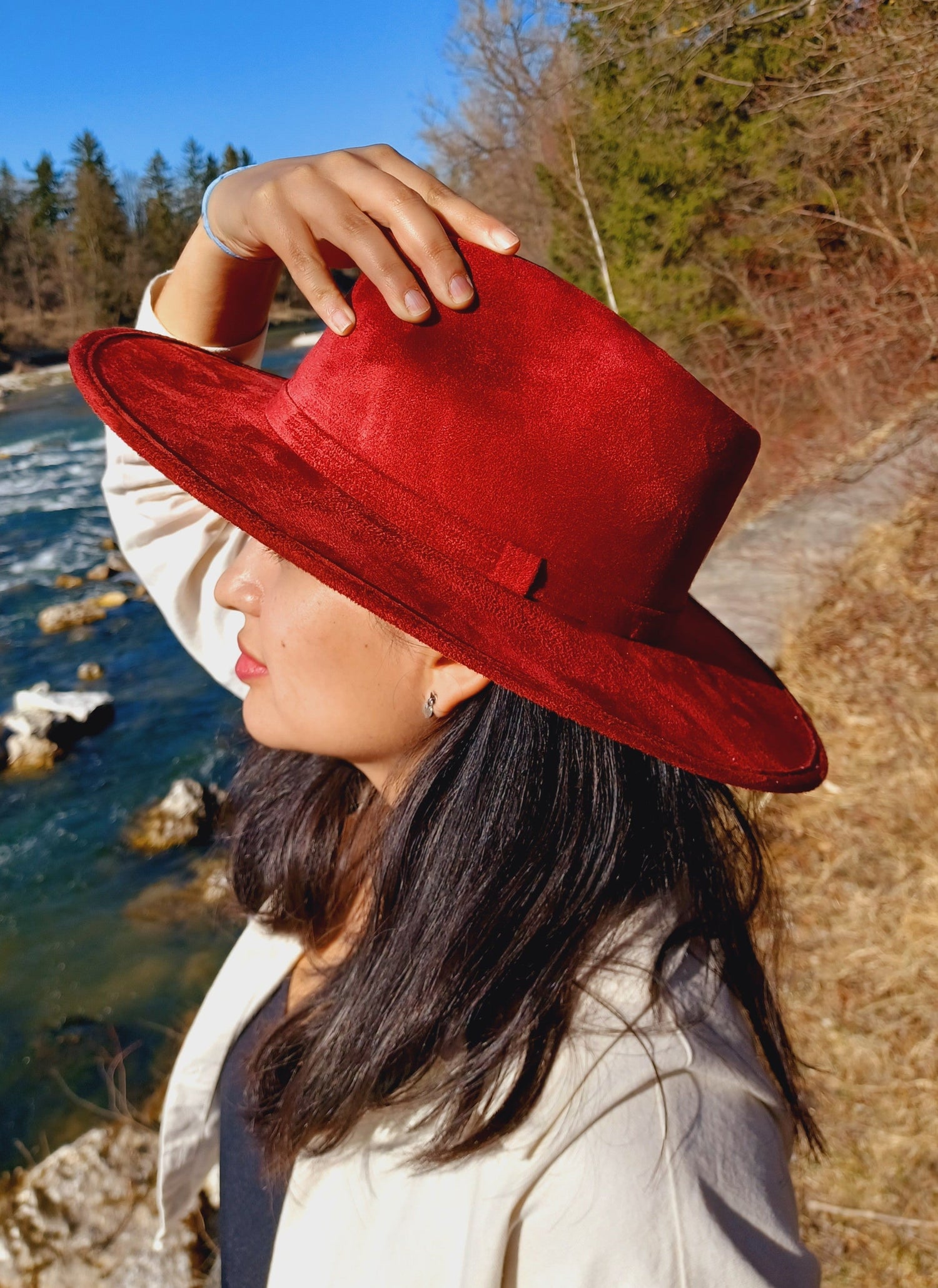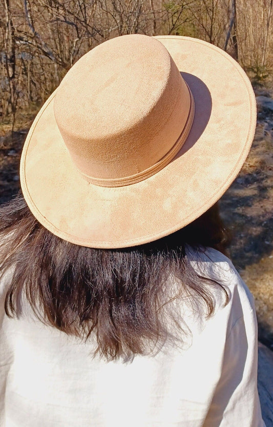 Boater Hat Handmade Hat Flat Brim Boho Hat, Suede Pink Hat