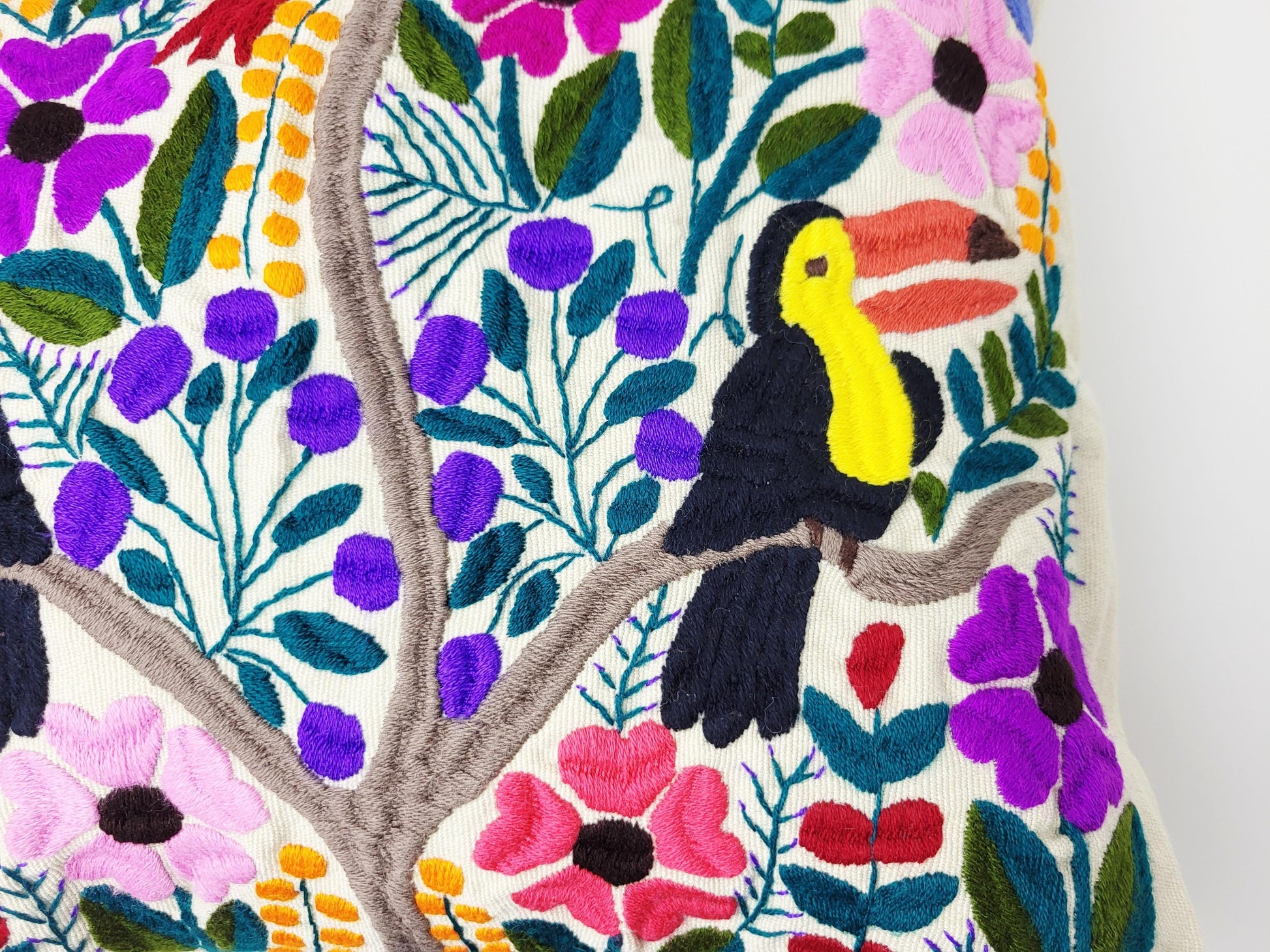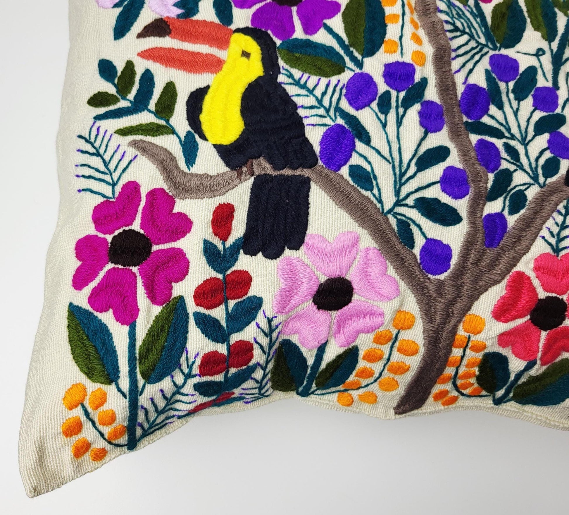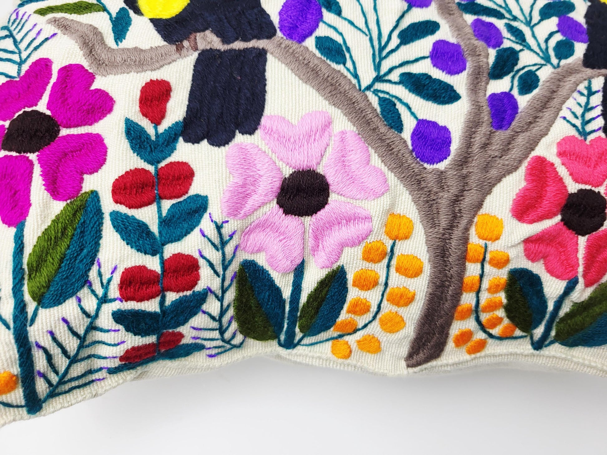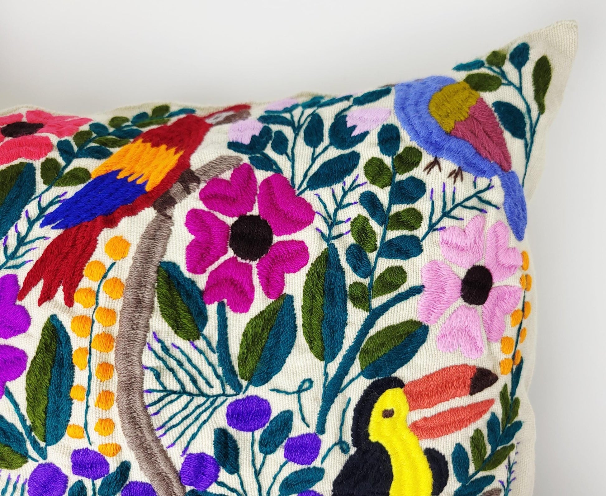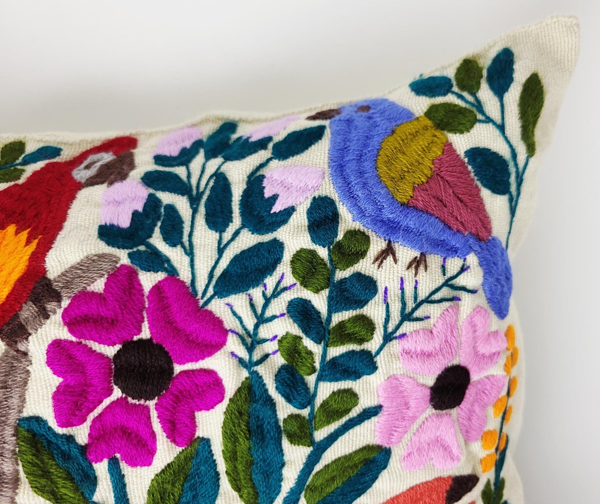 Bringen Sie mit diesem bezaubernden Kissenbezug aus Chiapas, Mexiko, Farbe und Charakter in Ihr Zuhause! Der kunstvoll bestickte Bezug mit einem wunderschönen Vogelmotiv verleiht jedem Raum eine fröhliche Atmosphäre.