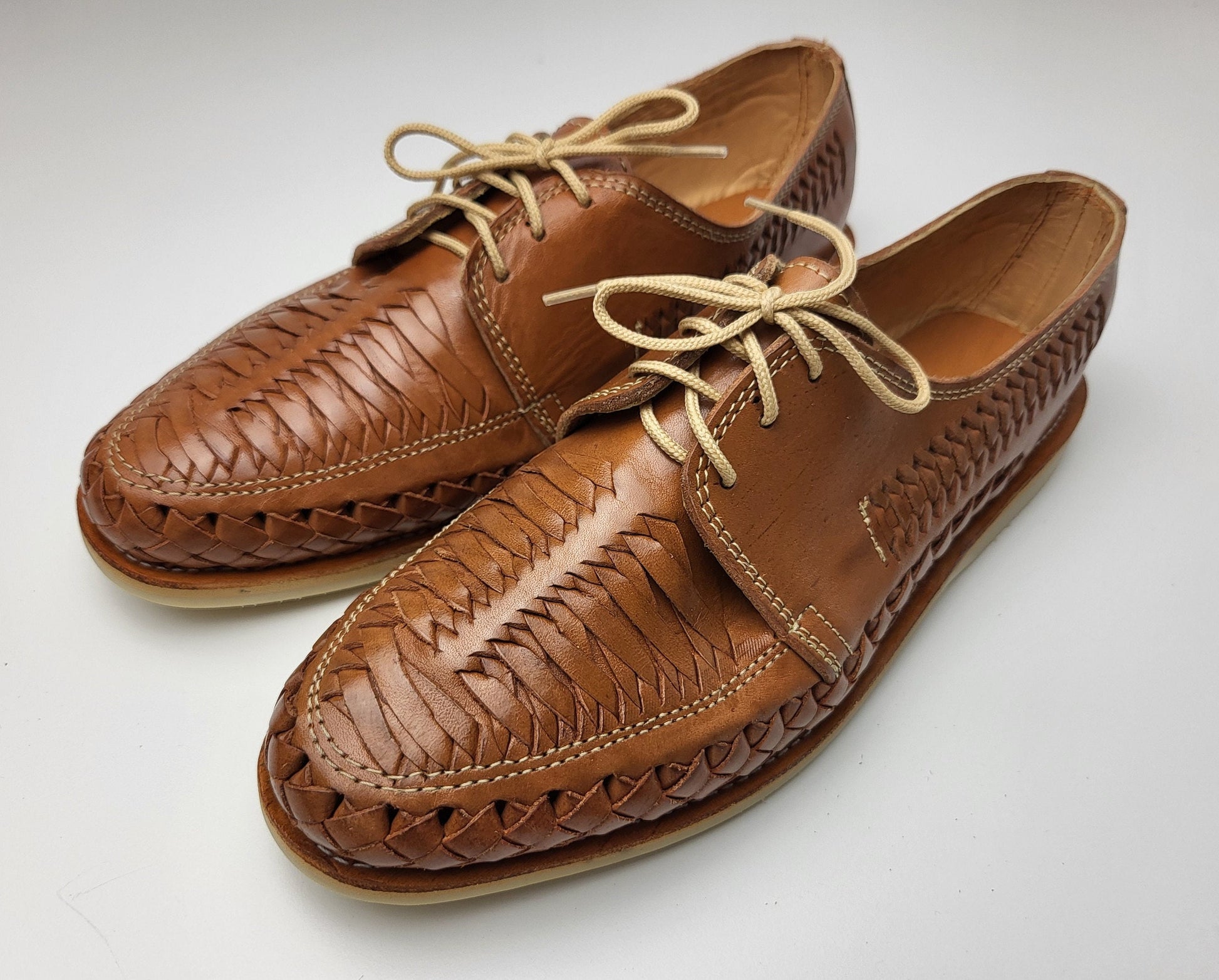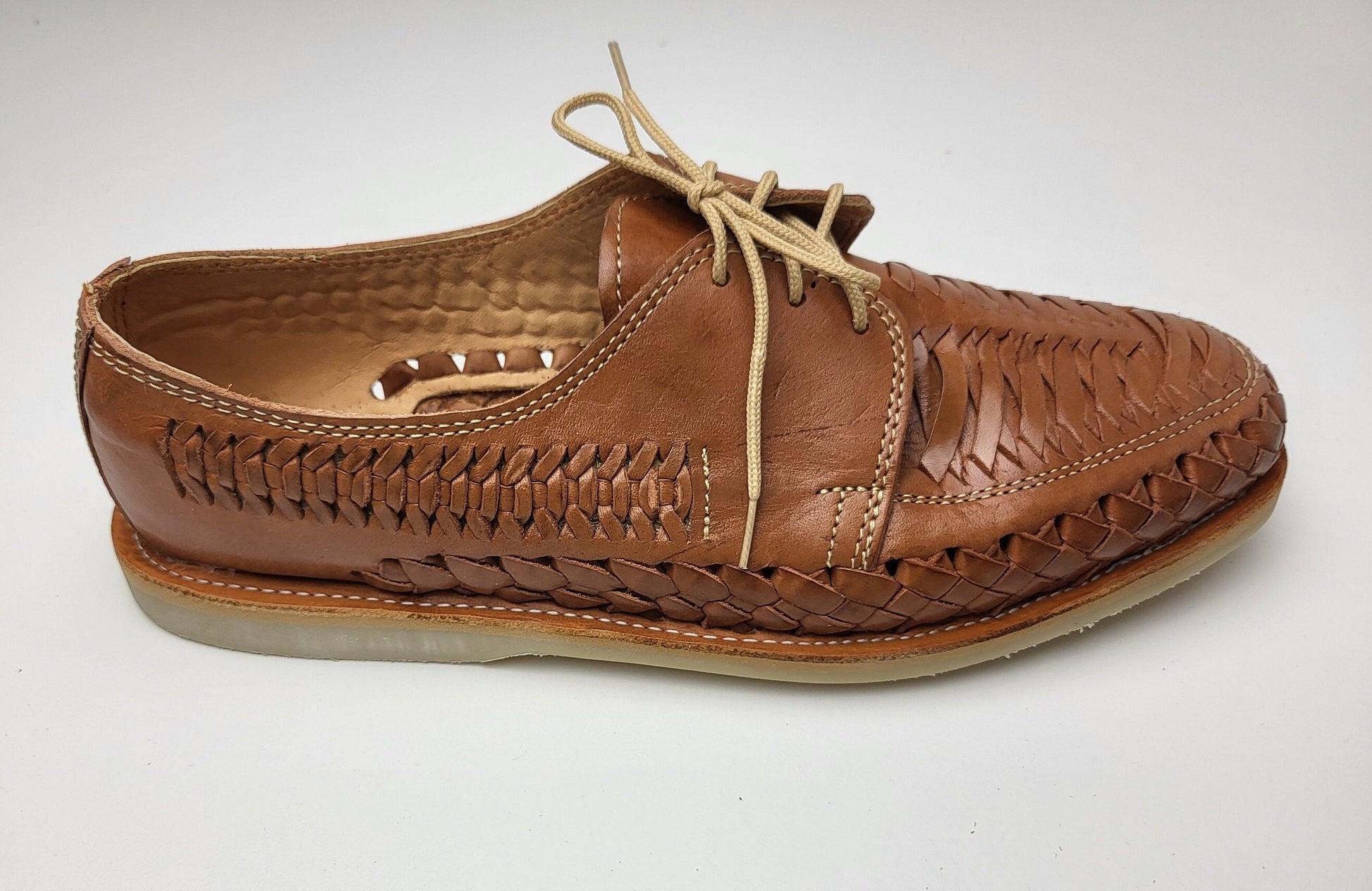 Fairmex presents its latest masterpiece: hand-woven leather shoes in a stunning combination of brown natural leather. These shoes are a celebration of traditional Mexican craftsmanship brought to life by skilled artisans. The intricately woven design forms a captivating lattice pattern that harmoniously blends the two colors for an elegant and distinctive look. These shoes are made by artisans in Guanajuato, Mexico
