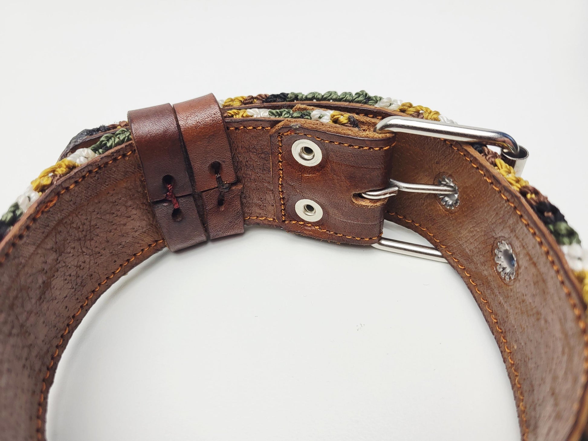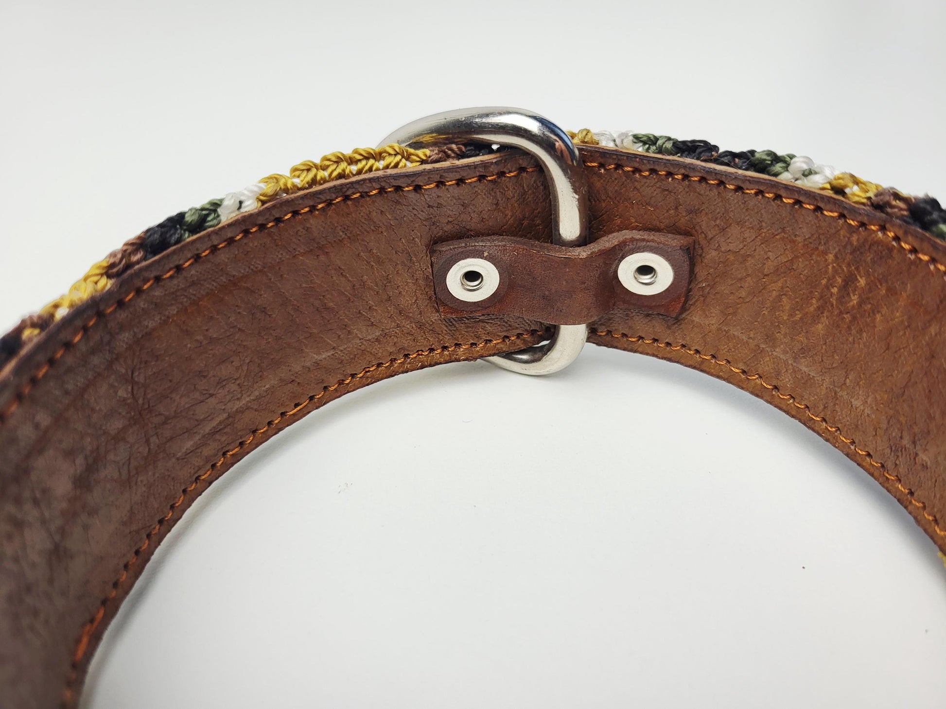 Dieses qualitativ hochwertige Hundehalband aus gegerbtem Leder und handgewebtem Nylon wurde zusammengenäht, um höchste Festigkeit und Stabilität zu erreichen.