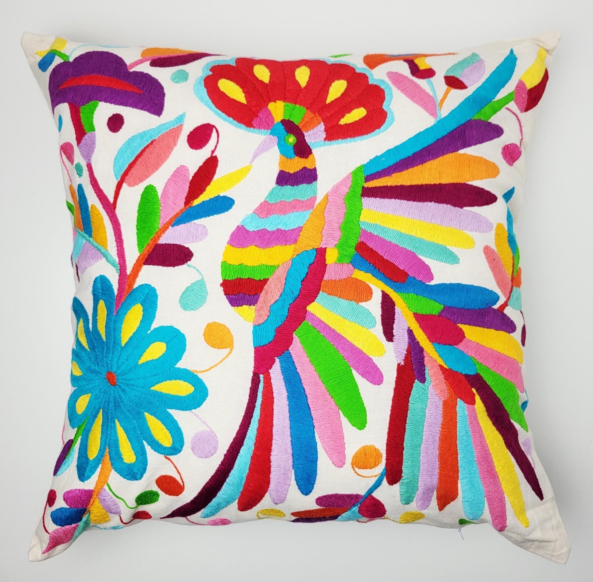 Entdecken Sie unsere exquisiten handbestickten mexikanischen Kissenbezüge im authentischen Otomi-Stil. Diese einzigartigen Kunstwerke, mit den Maßen 45 x 45 cm und einem praktischen Reißverschluss, wurden liebevoll von Mr. Tolentino und seiner Familie im Bundesstaat Hidalgo handgefertigt.