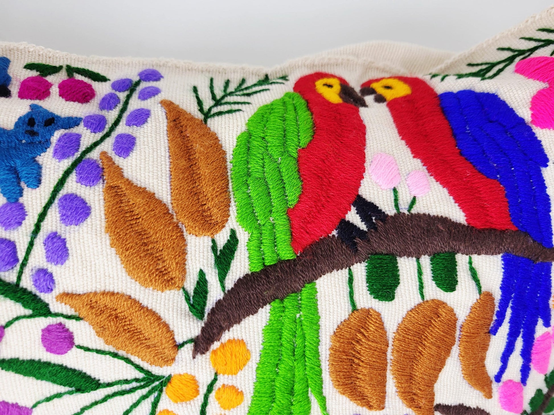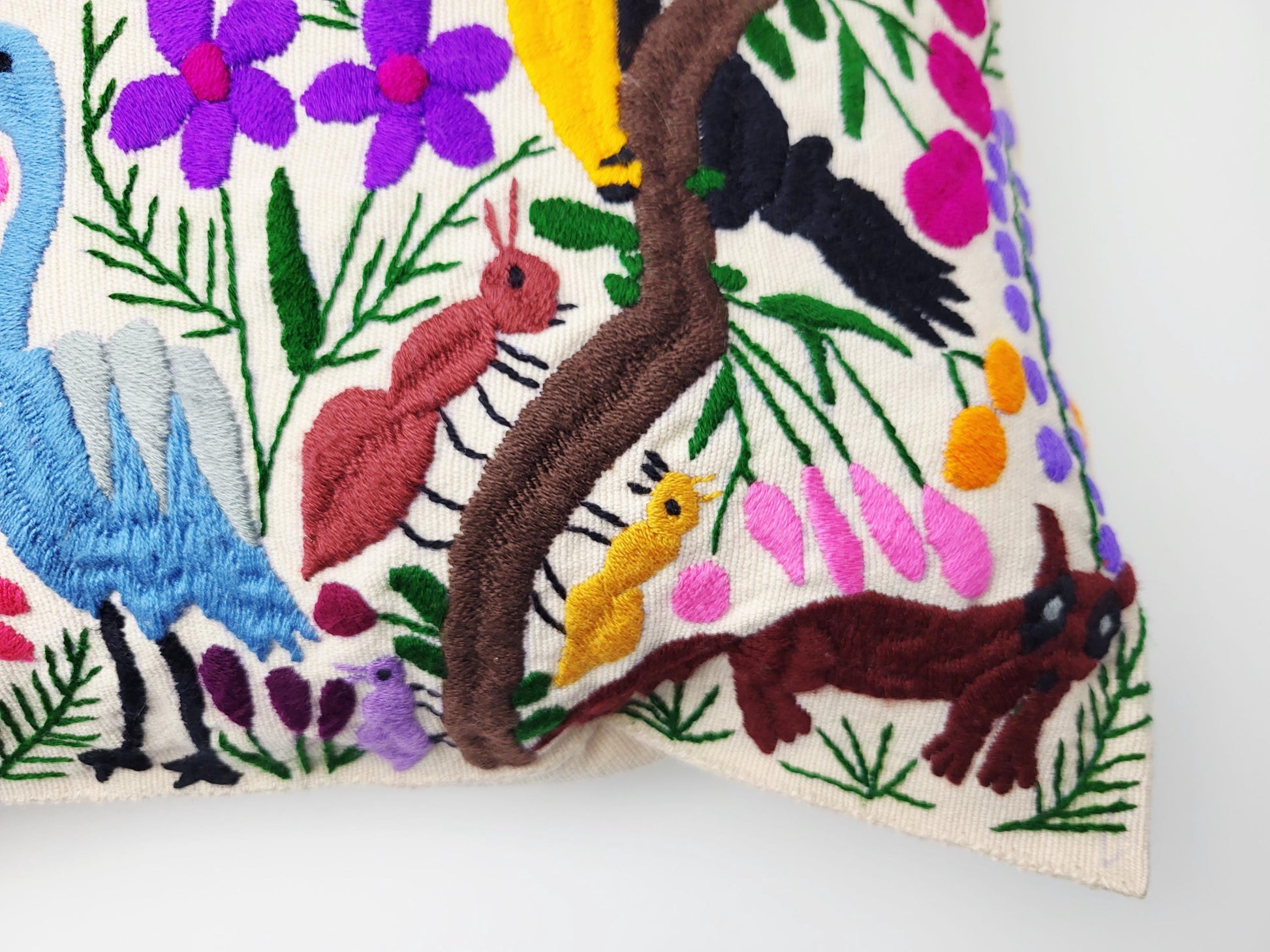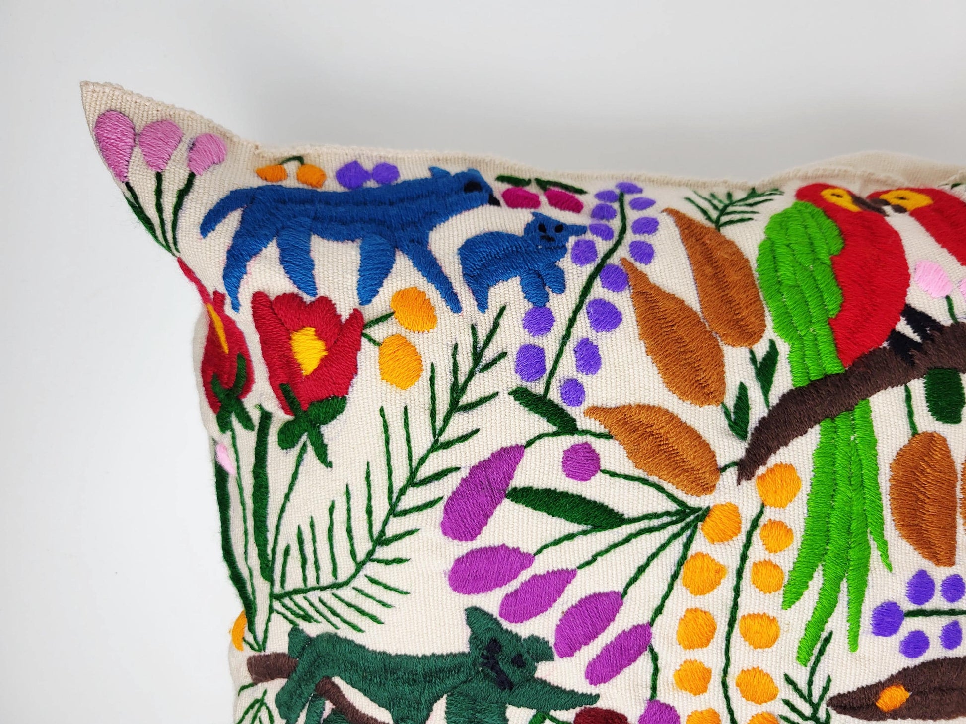 Besticktes und gewebtes Kissen aus Mexiko, Kissenhülle mit Tiermuster aus Mexiko