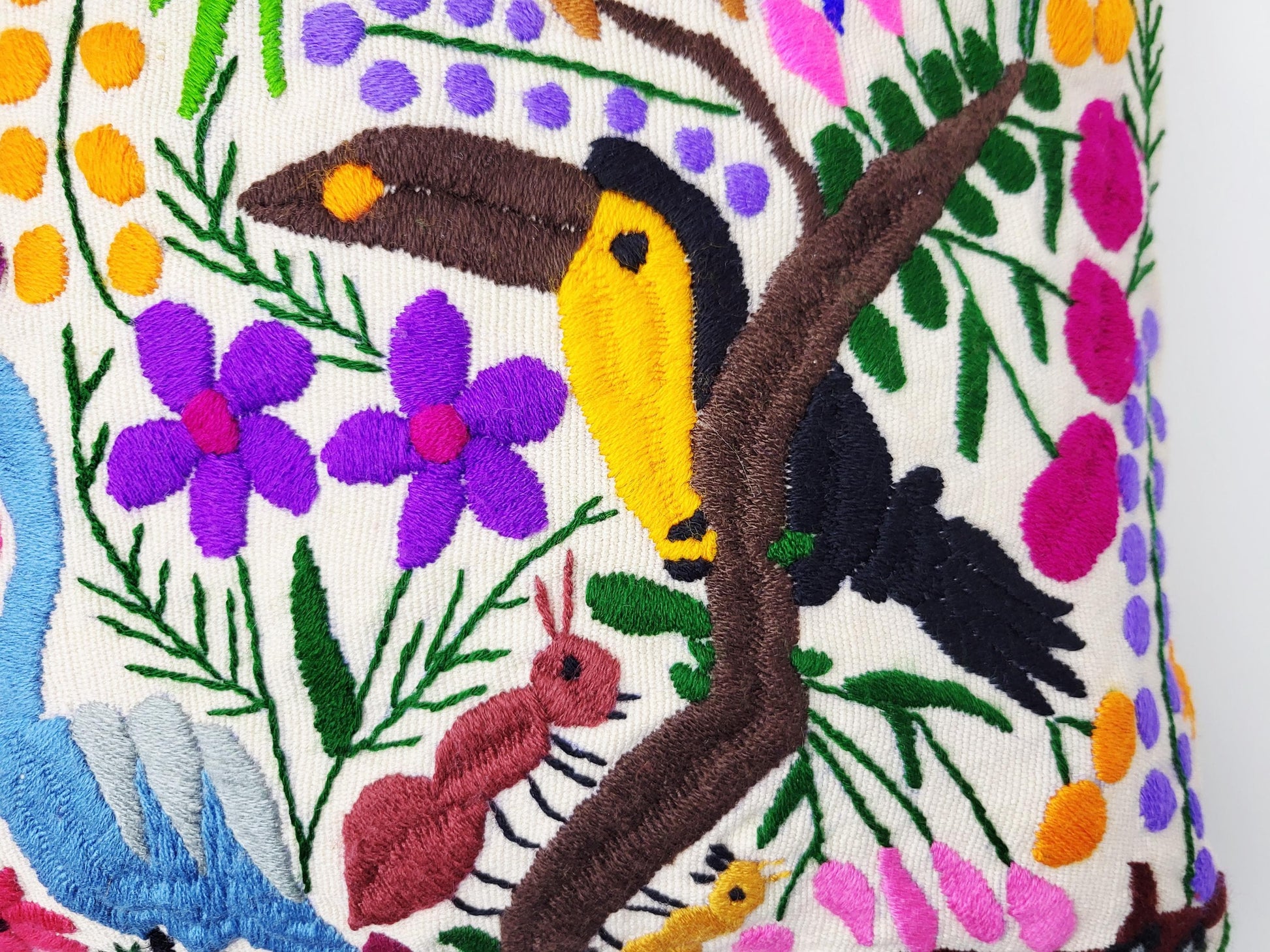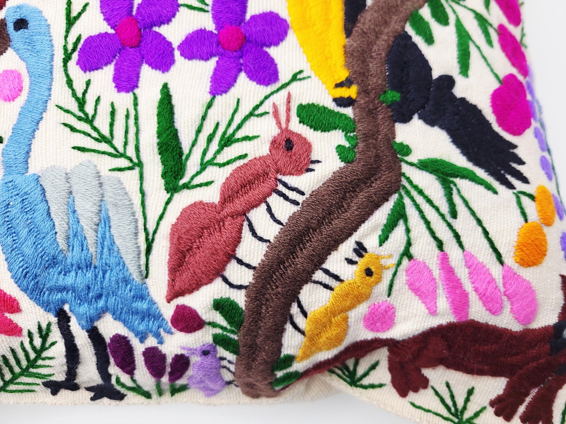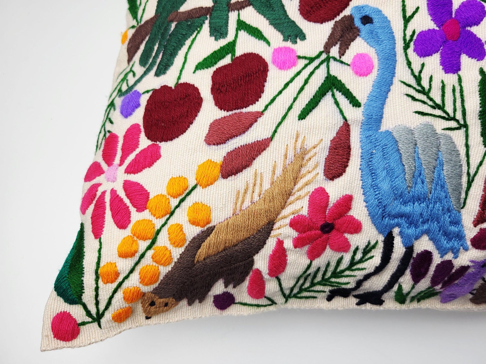 Besticktes und gewebtes Kissen aus Mexiko, Kissenhülle mit Tiermuster aus Mexiko