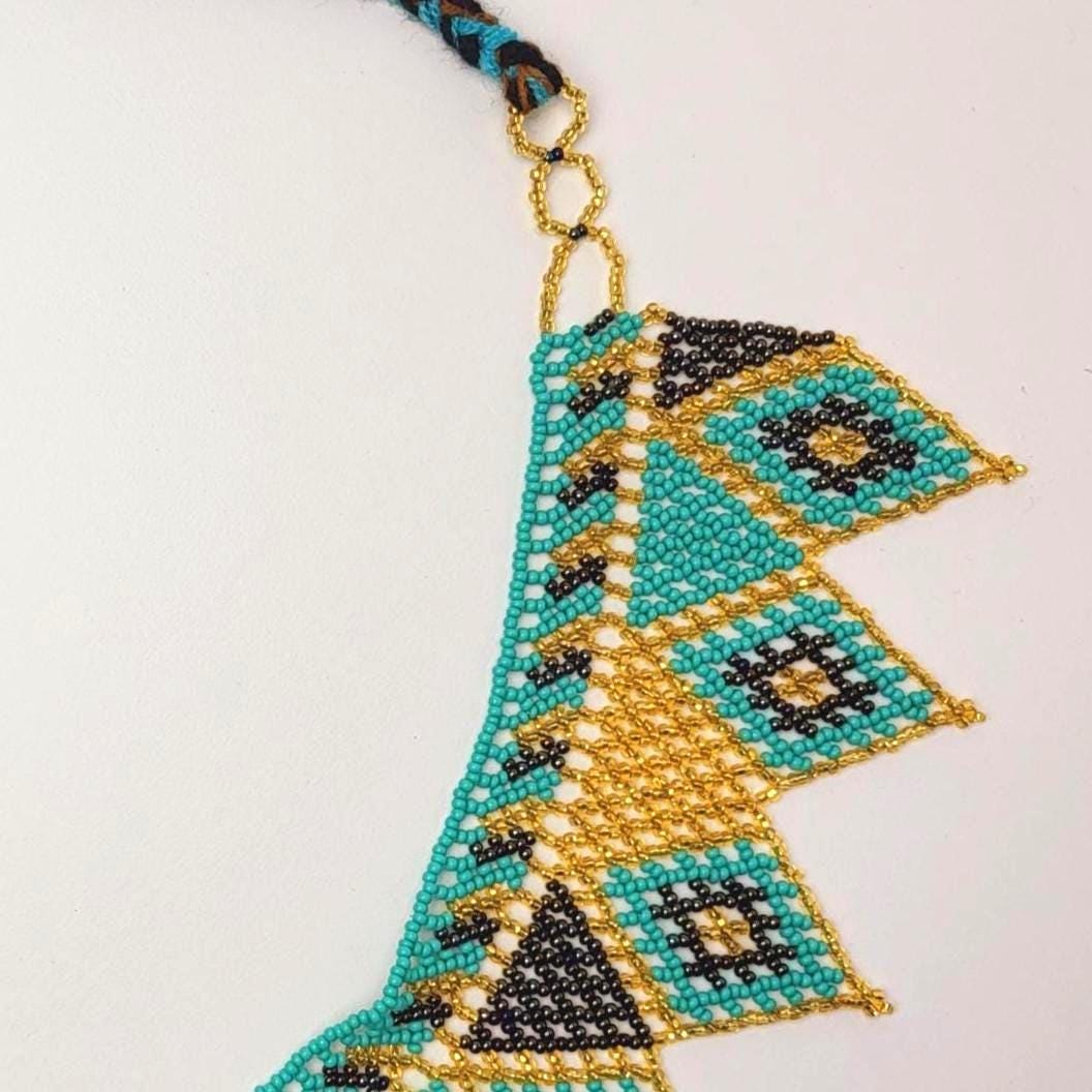 Diese einzigartige Perlenkette ist ein kunstvolles Meisterwerk, handgefertigt von indigenen Frauen aus Chiapas, Mexiko. Jede Kette besteht aus hunderten filigranen Glasperlen, die mit traditioneller Technik zu einem farbenfrohen und detailreichen Muster verwoben werden.