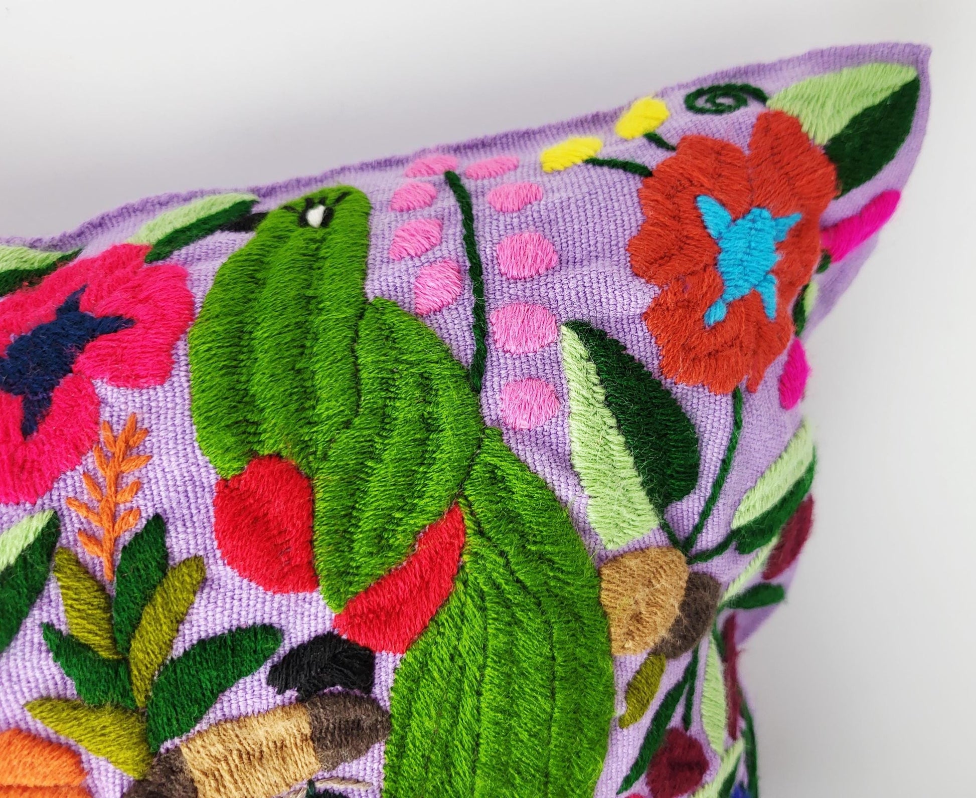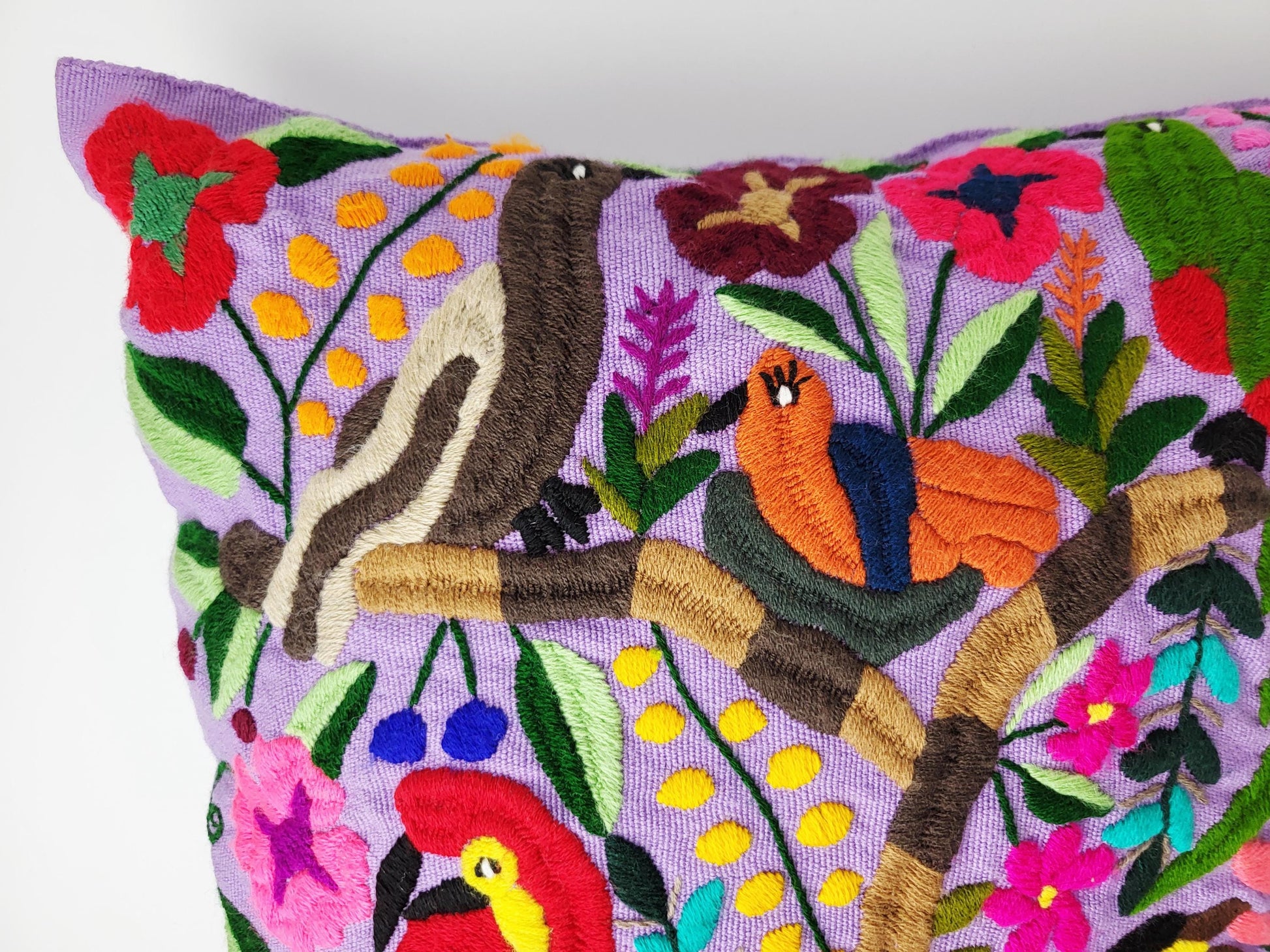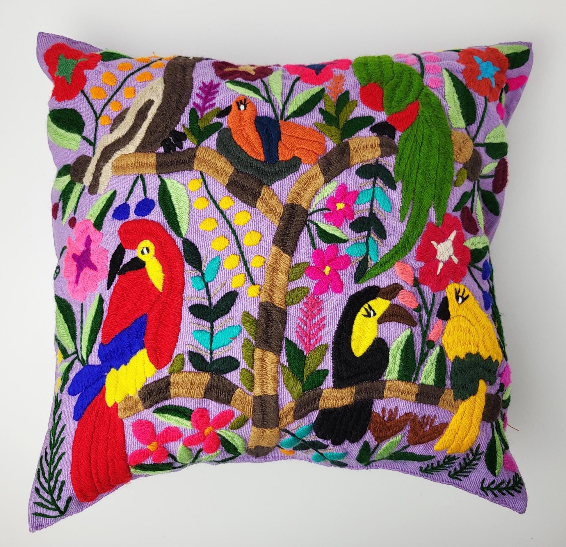 Authentisches mexikanisches Dekokissen handgemacht von Cristy Perez und ihrer Familie aus Chiapas. Jeder handbestickte Kissenbezug wird traditionell auf dem Maya-Webstuhl gewebt und anschließend mit bunten Tiermotiven Stich für Stich bestickt - echte Maya Handwerkskunst ohne Massenproduktion.