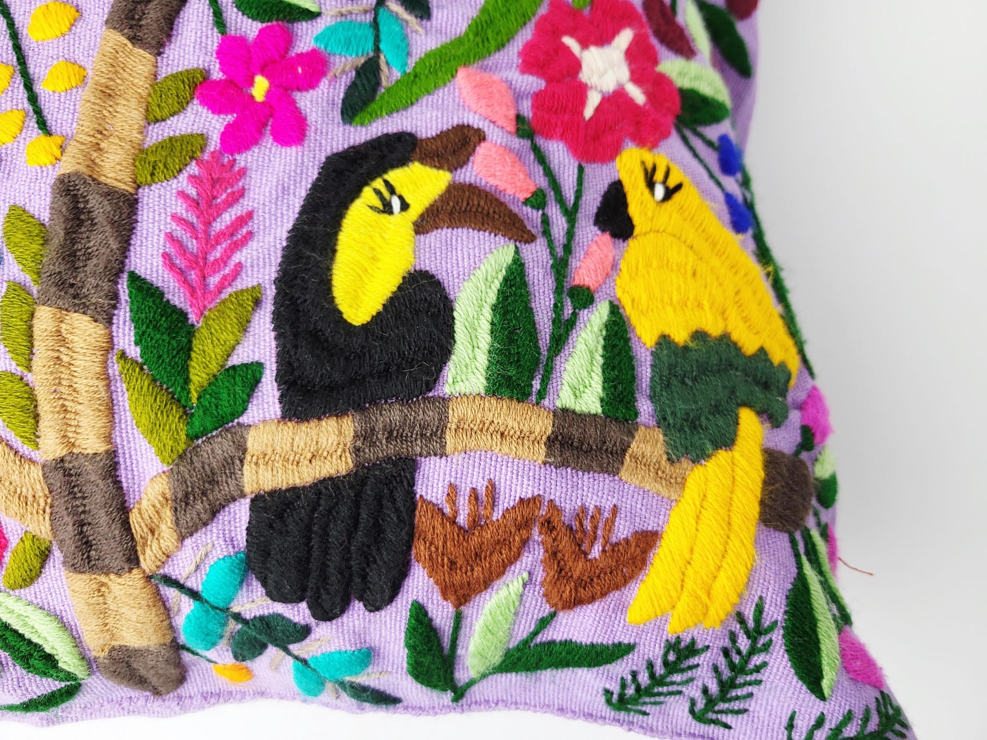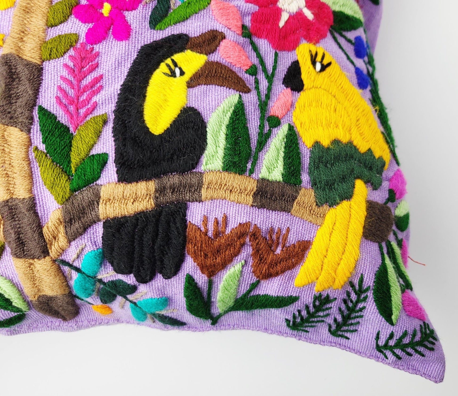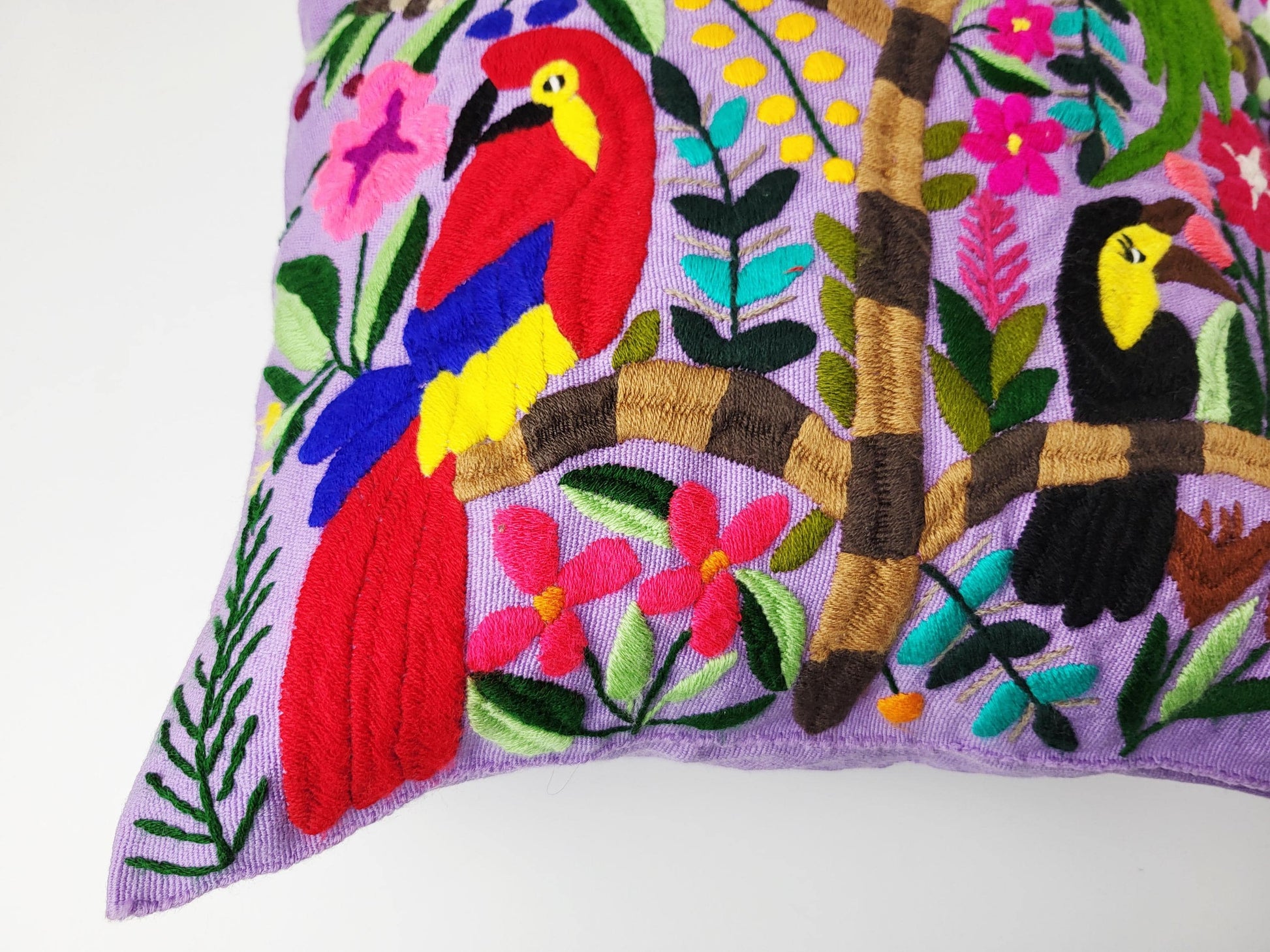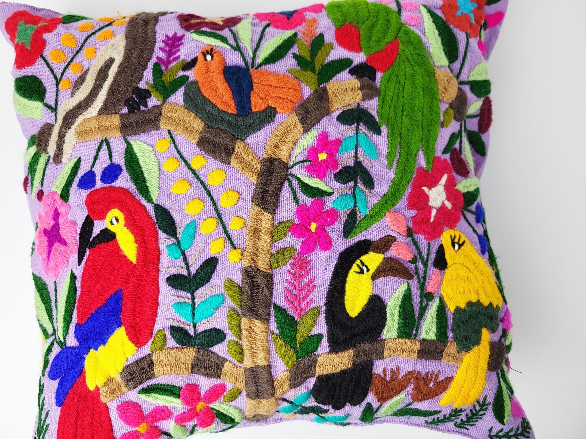 Authentisches mexikanisches Dekokissen handgemacht von Cristy Perez und ihrer Familie aus Chiapas. Jeder handbestickte Kissenbezug wird traditionell auf dem Maya-Webstuhl gewebt und anschließend mit bunten Tiermotiven Stich für Stich bestickt - echte Maya Handwerkskunst ohne Massenproduktion.