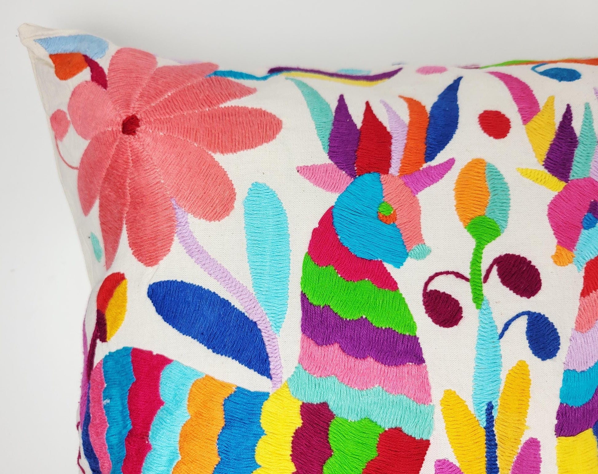 Bringe Farbe und Kultur in dein Zuhause mit diesem einzigartigen Kissenbezug im traditionellen Otomí-Stil. Jedes Stück wird sorgfältig von Señor Tolentino und seiner Familie im Bundesstaat Hidalgo, Mexiko, von Hand bestickt - ein wahres Meisterwerk indigener Textilkunst.