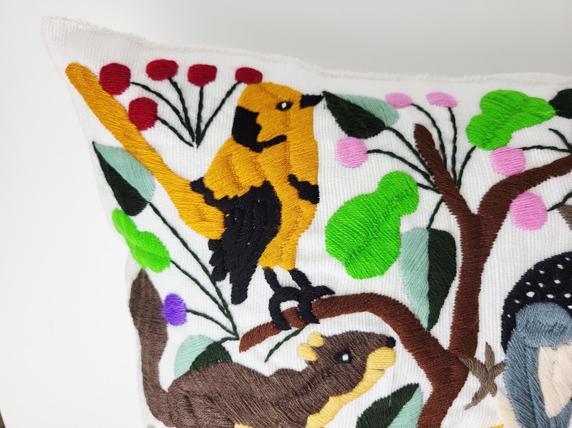 Farbenfroher mexikanischer Kissenbezug mit tropischem Tiermuster. Handgefertigt in Chiapas, Mexiko