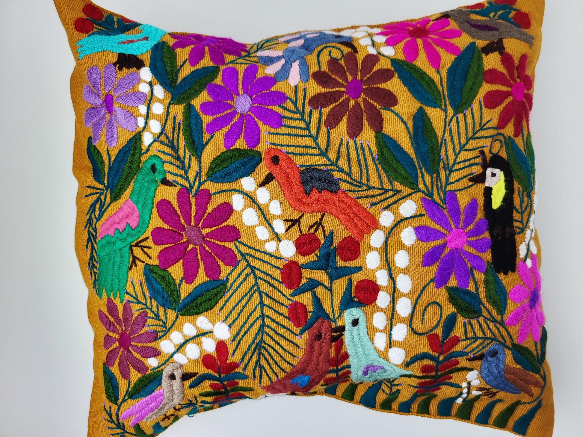 Farbenfroher mexikanischer Kissenbezug mit tropischem Tiermuster. Handgefertigt in Chiapas, Mexiko