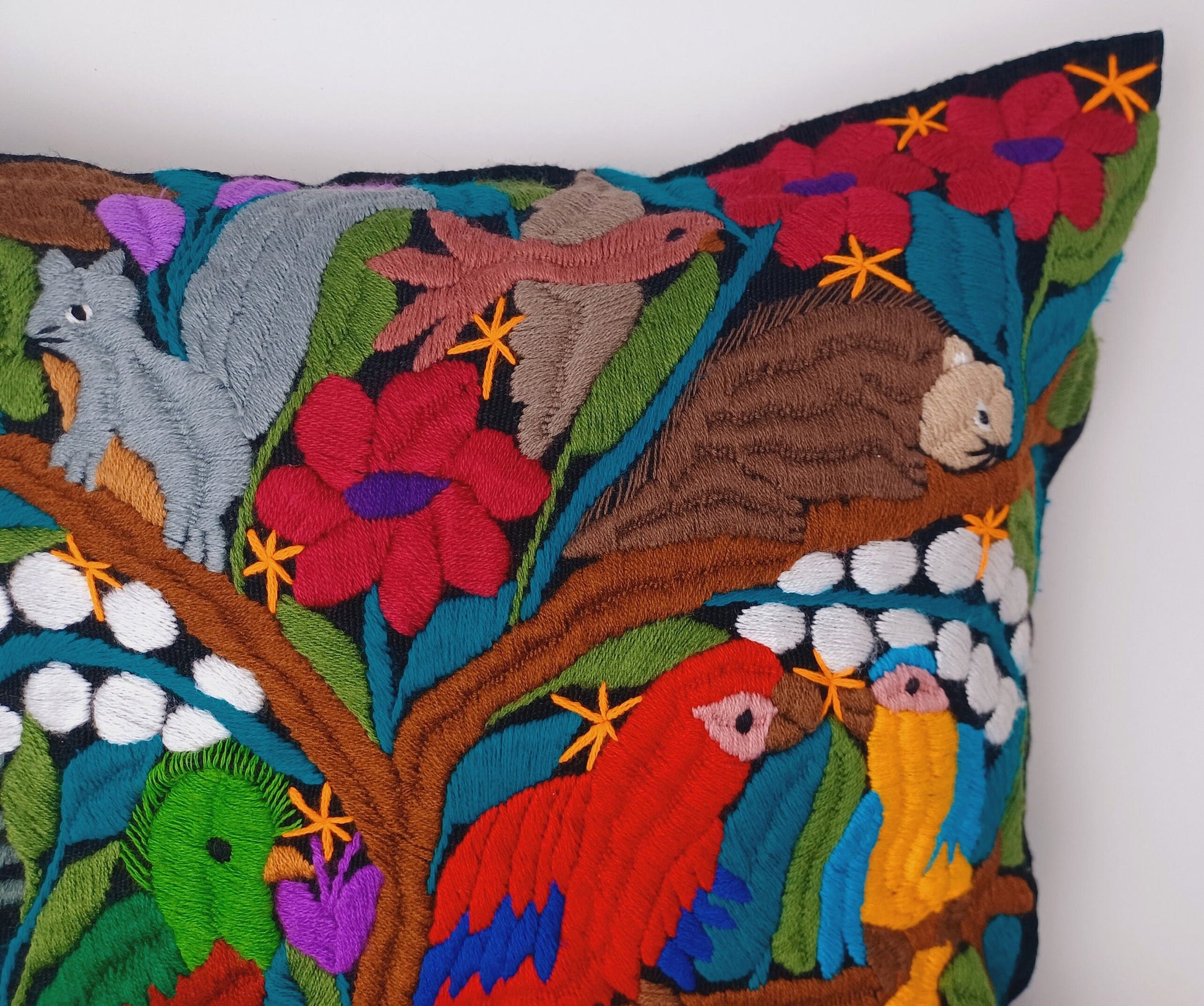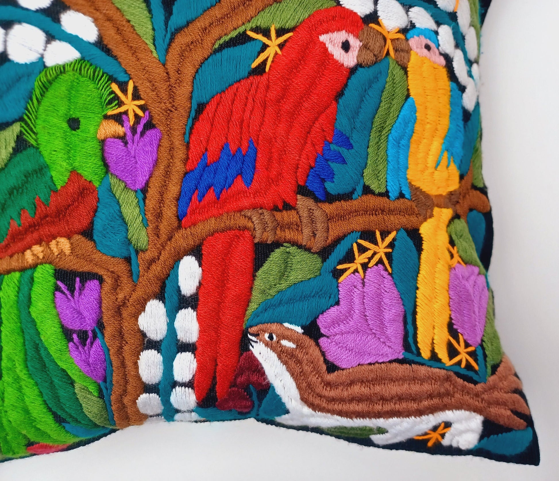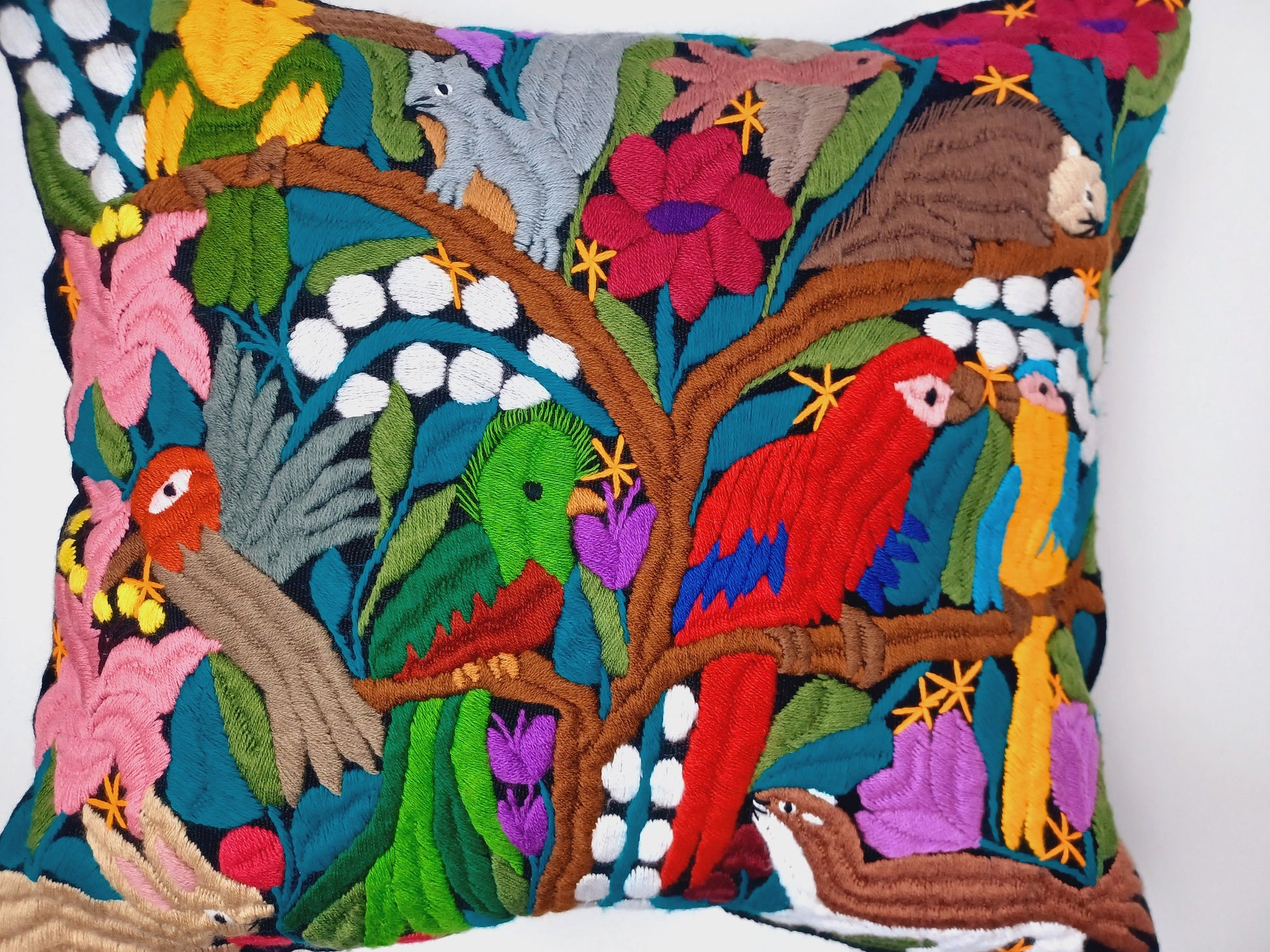 Housse de coussin mexicaine colorée avec motif d'animaux tropicaux. Fabriqué à la main au Chiapas, au Mexique