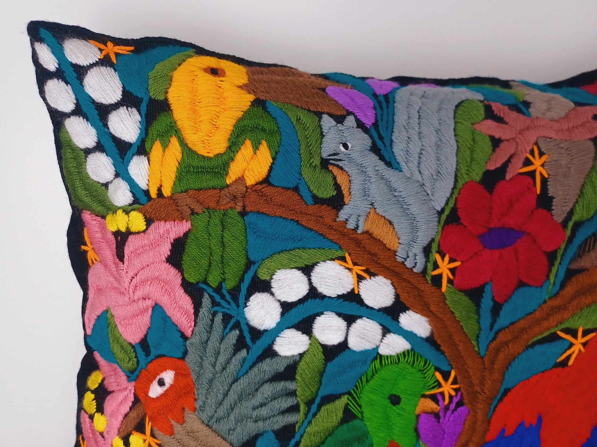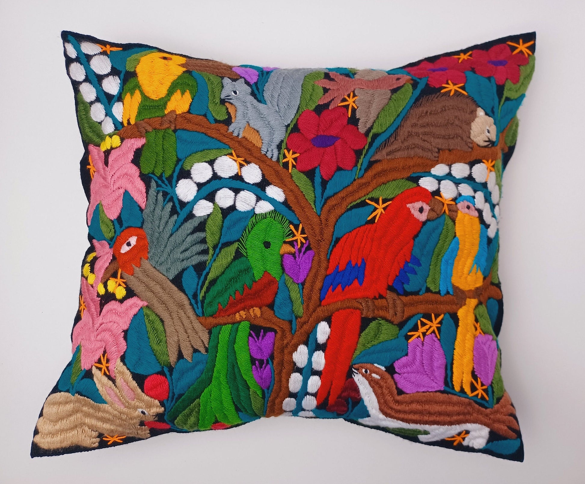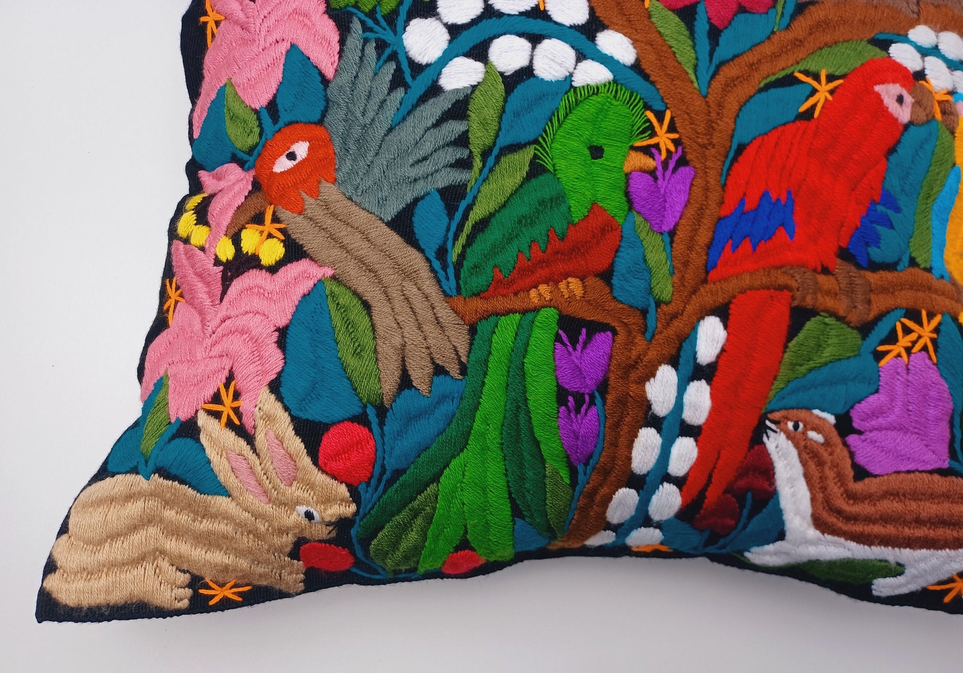 Housse de coussin mexicaine colorée avec motif d'animaux tropicaux. Fabriqué à la main au Chiapas, au Mexique