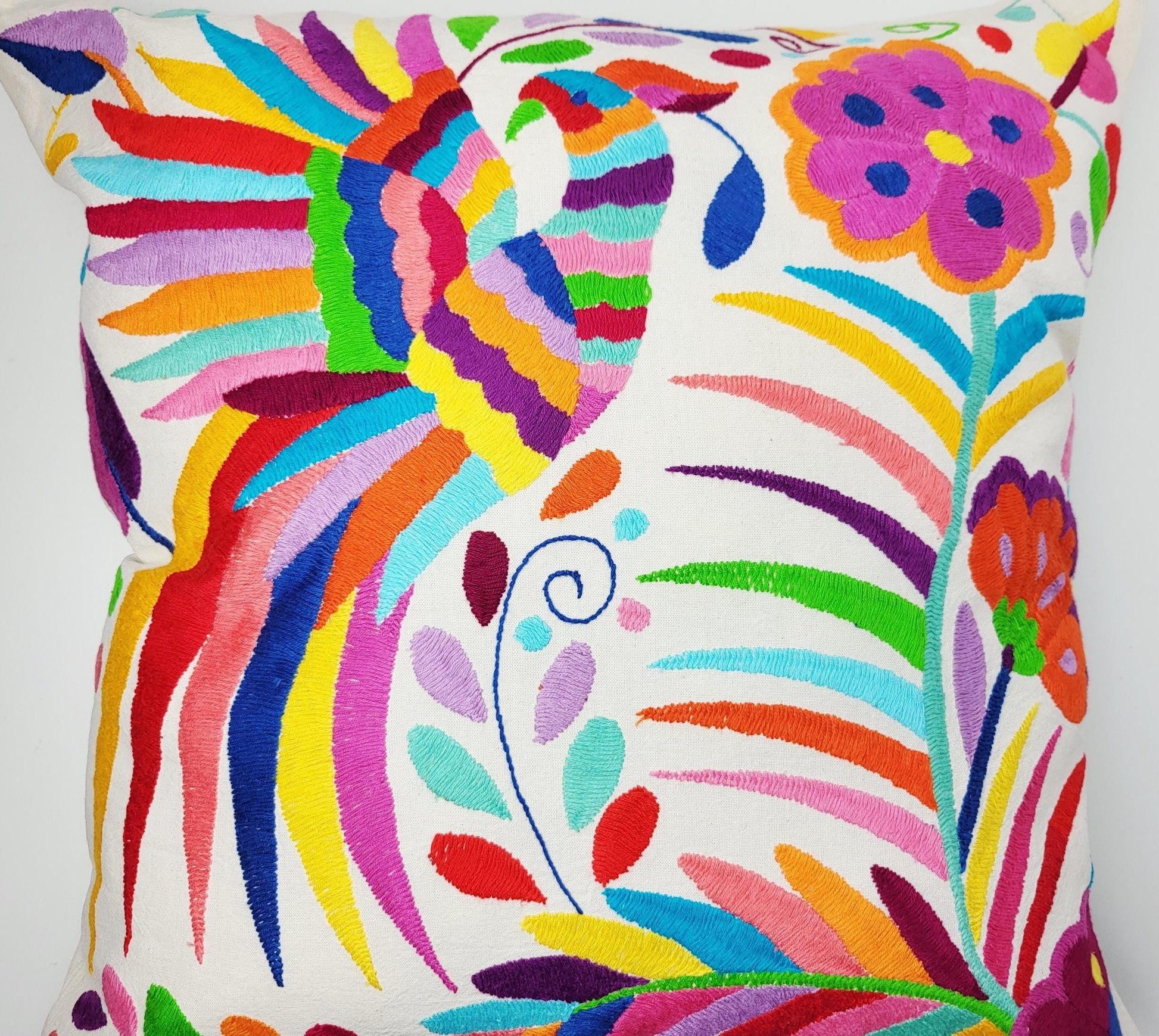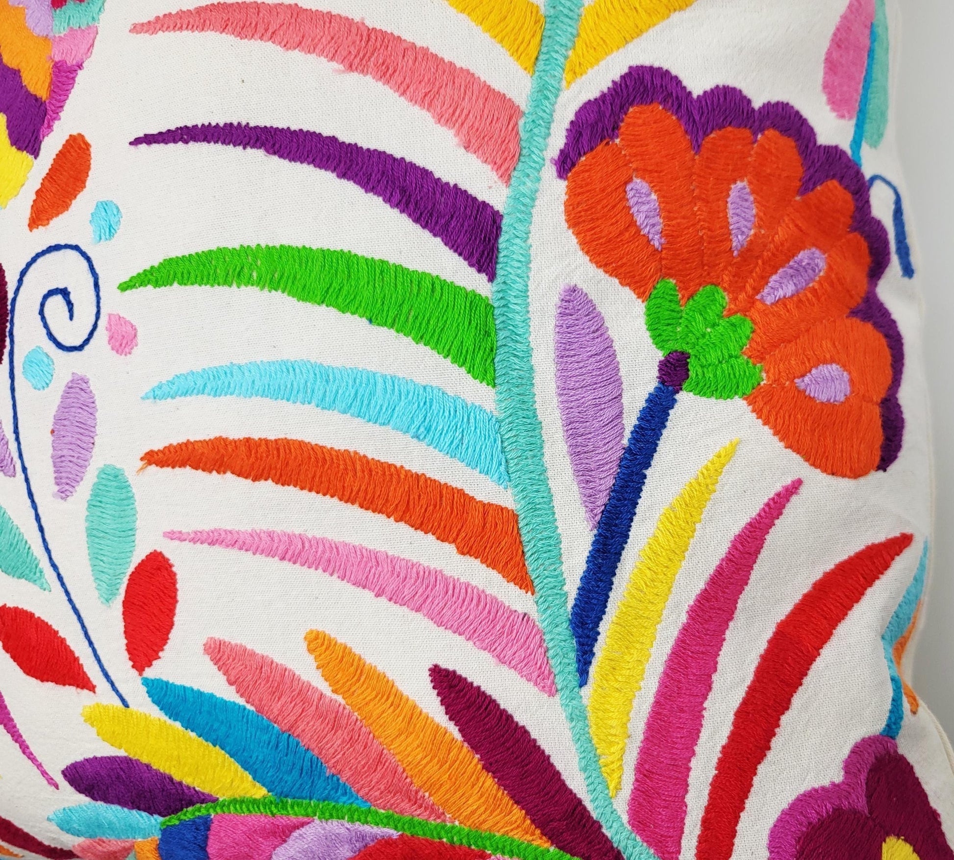 Dieser handbestickte Kissenbezug aus Baumwolle trägt die jahrhundertealte Tradition der Otomi-Stickkunst in sich. Gefertigt von indigenen Kunsthandwerkern in Hidalgo, Mexiko - jedes Stück ein echtes Unikat.