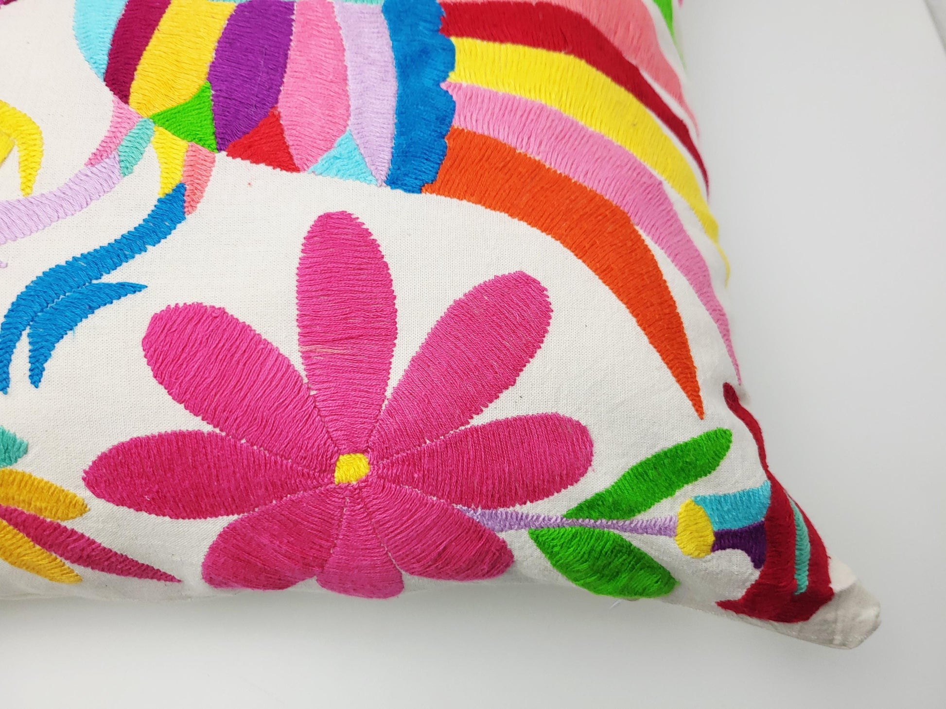 Dieser handbestickte Kissenbezug aus Baumwolle trägt die jahrhundertealte Tradition der Otomi-Stickkunst in sich. Gefertigt von indigenen Kunsthandwerkern in Hidalgo, Mexiko - jedes Stück ein echtes Unikat.