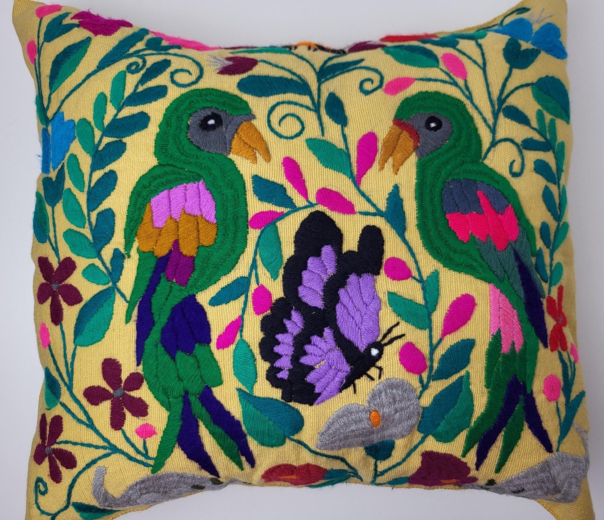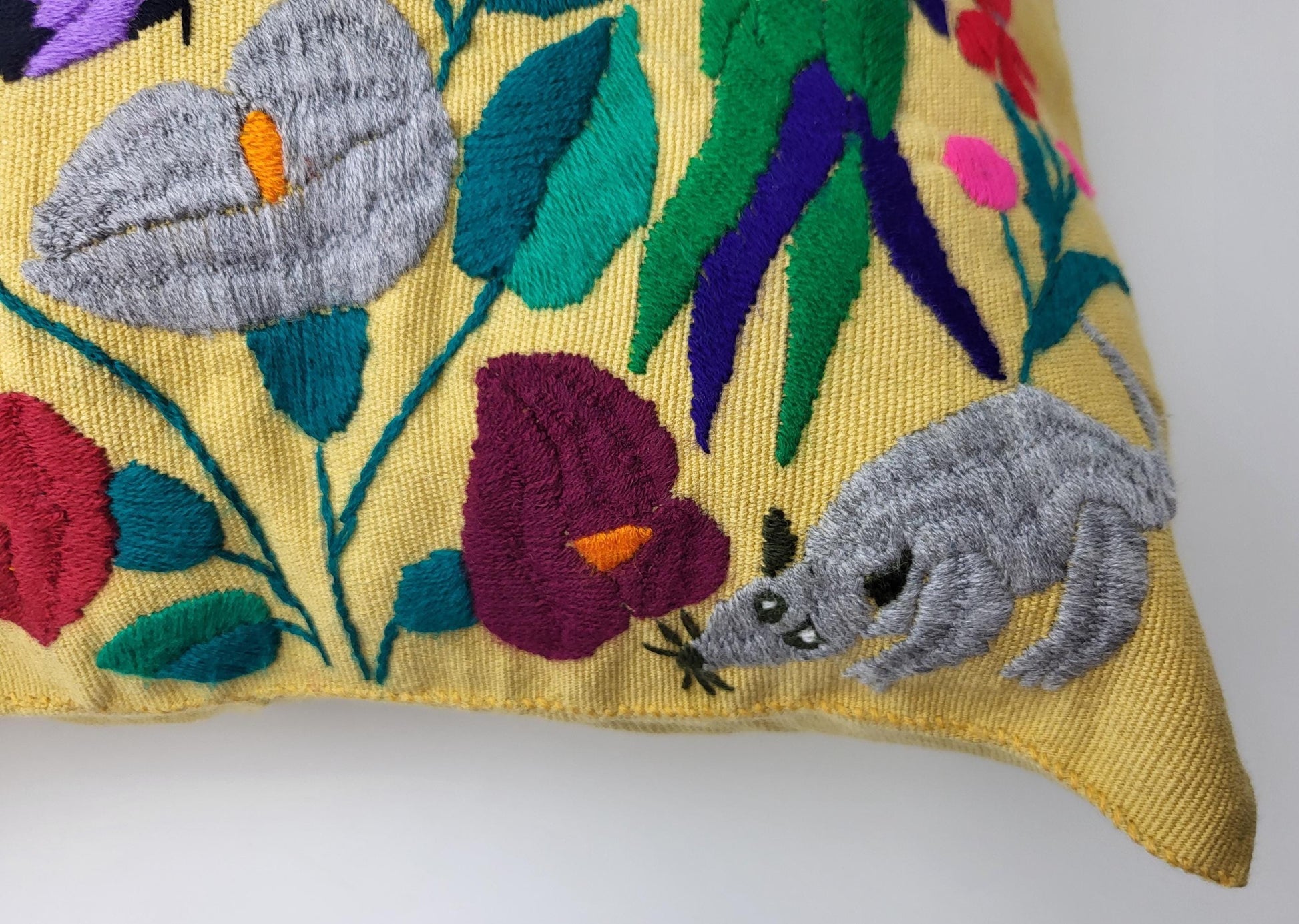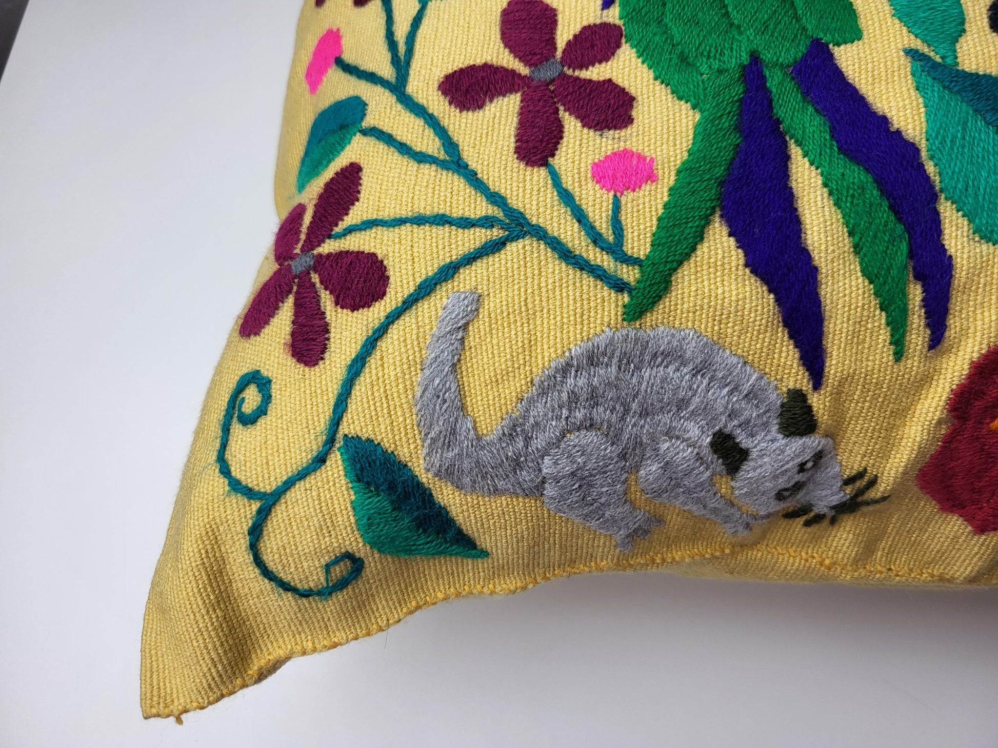 Besticktes und gewebtes Kissen aus Mexiko, Kissenhülle mit Tiermuster aus Mexiko