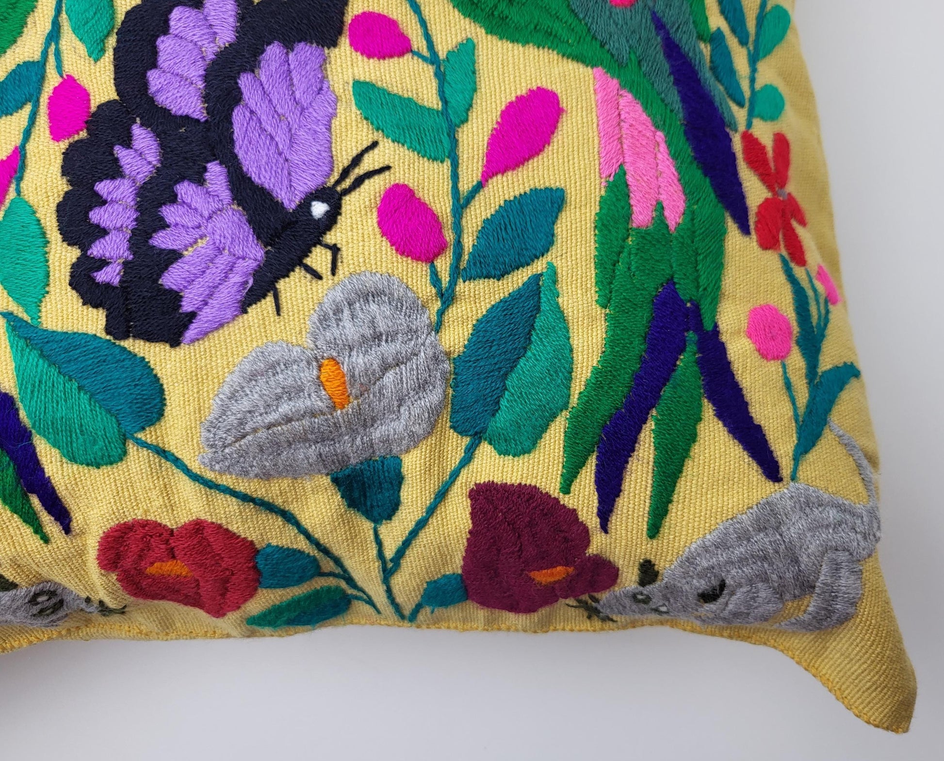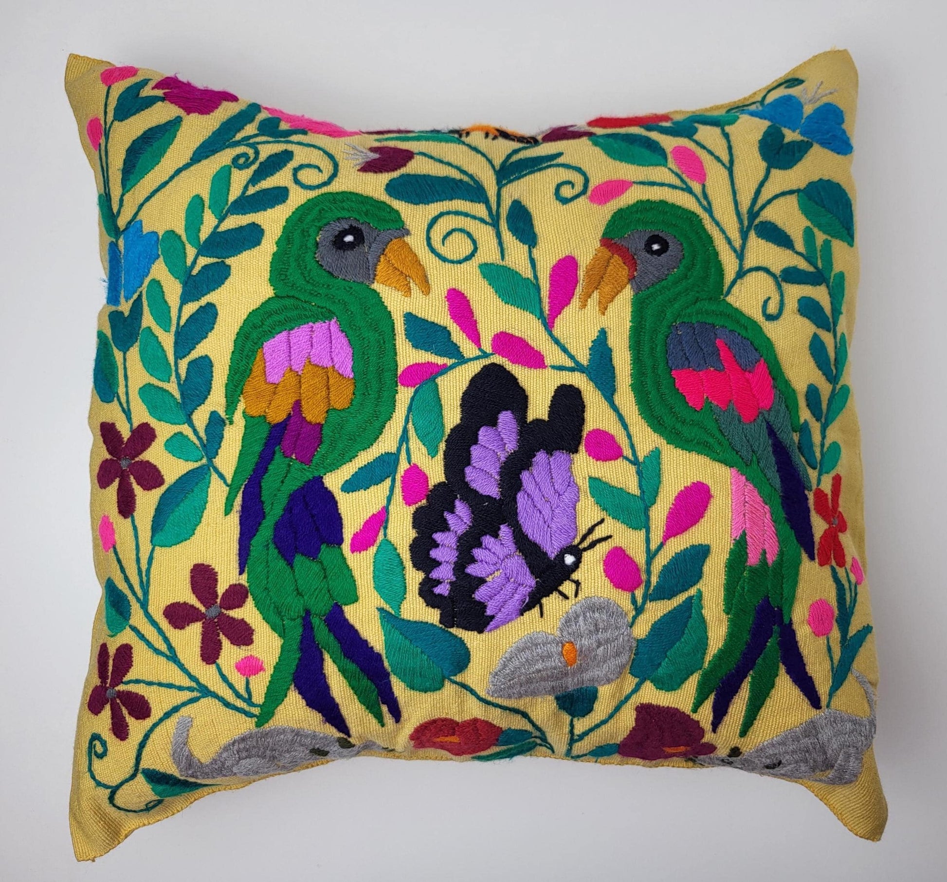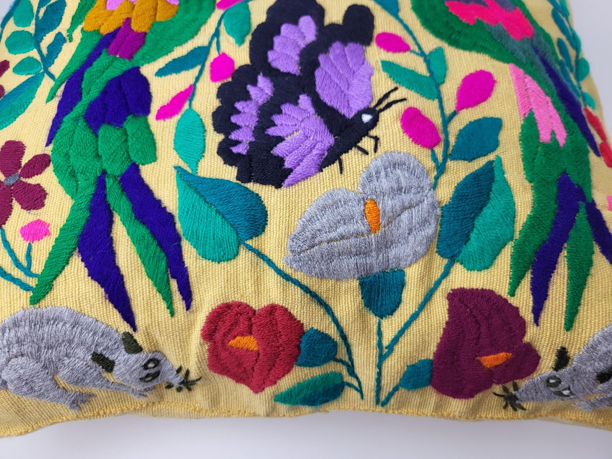Besticktes und gewebtes Kissen aus Mexiko, Kissenhülle mit Tiermuster aus Mexiko
