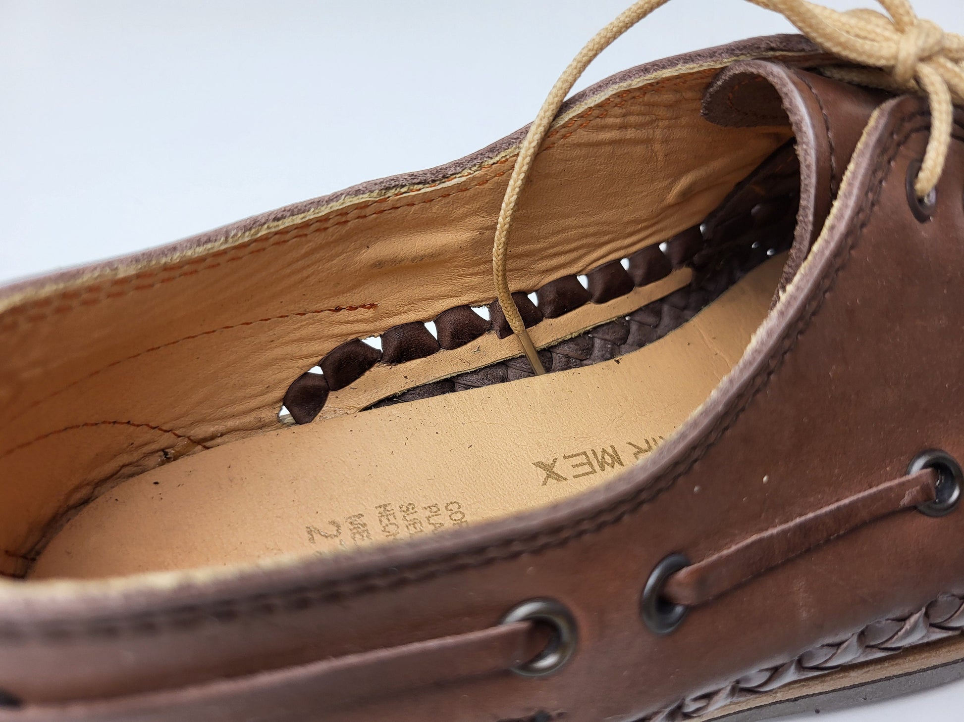 Fairmex präsentiert sein neuestes Meisterwerk: handgeflochtene Lederschuhe in einer atemberaubenden Kombination aus braunem natürlichem Leder. Diese Schuhe sind ein Fest der traditionellen mexikanischen Handwerkskunst, die von erfahrenen Handwerkern zum Leben erweckt wird. Das kompliziert gewebte Design bildet ein fesselndes Gittermuster, das die beiden Farben harmonisch miteinander verbindet und einen eleganten und unverwechselbaren Look erzielt. Diese Schuhe Stammen von Kunsthandwerkern aus Guanajuato, Mexiko