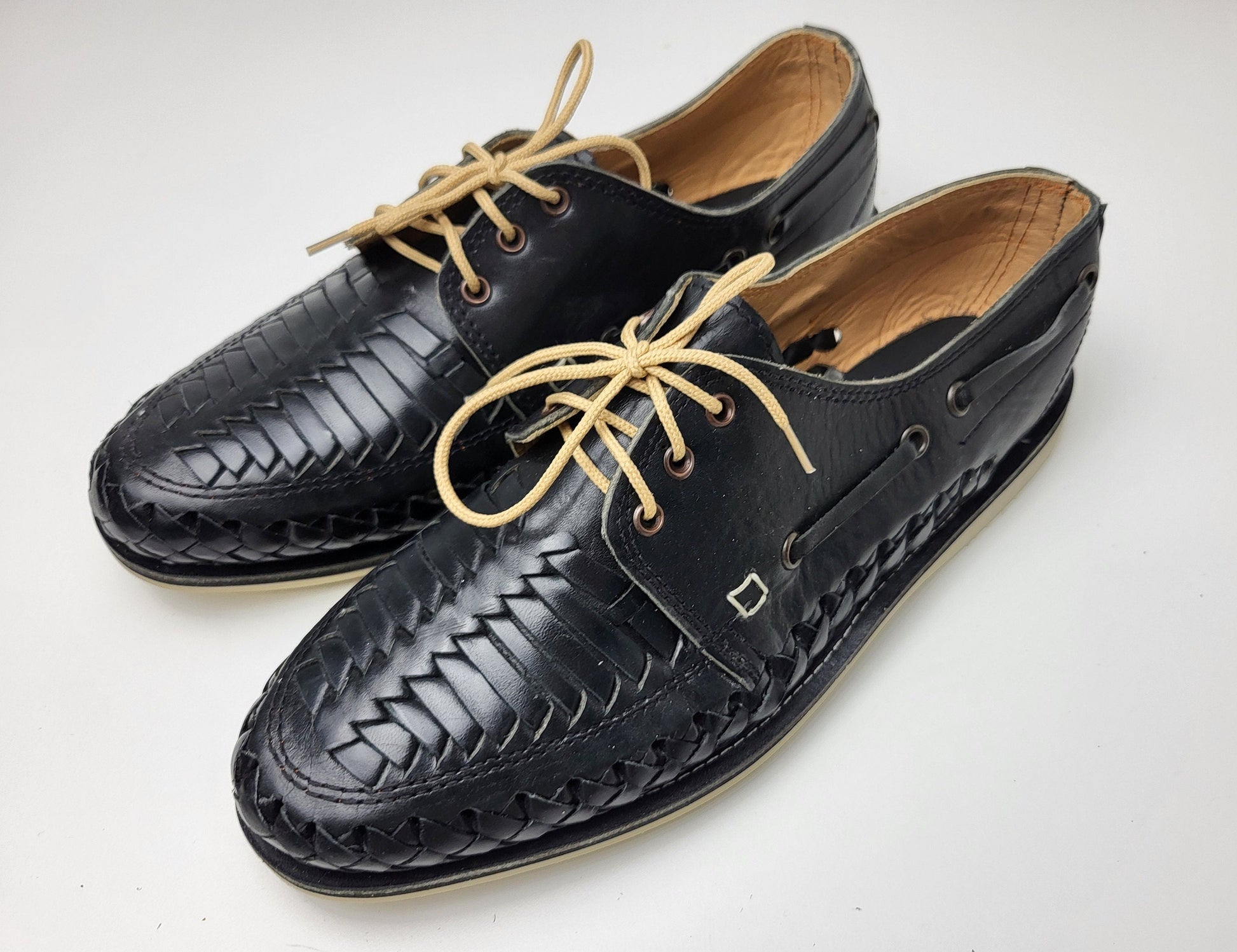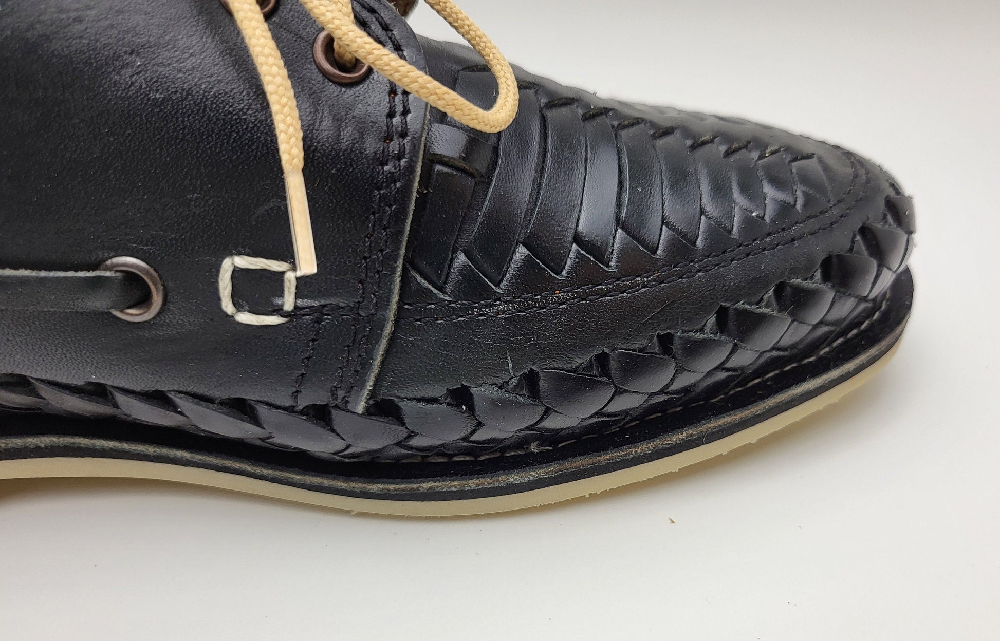 Fairmex präsentiert sein neuestes Meisterwerk: handgeflochtene Lederschuhe in einer atemberaubenden Kombination aus schwarzem natürlichem Leder. Diese Schuhe sind ein Fest der traditionellen mexikanischen Handwerkskunst, die von erfahrenen Handwerkern zum Leben erweckt wird. Das kompliziert gewebte Design bildet ein fesselndes Gittermuster, das die beiden Farben harmonisch miteinander verbindet und einen eleganten und unverwechselbaren Look erzielt. Diese Schuhe Stammen von Kunsthandwerkern aus Guanajuato, Mexiko