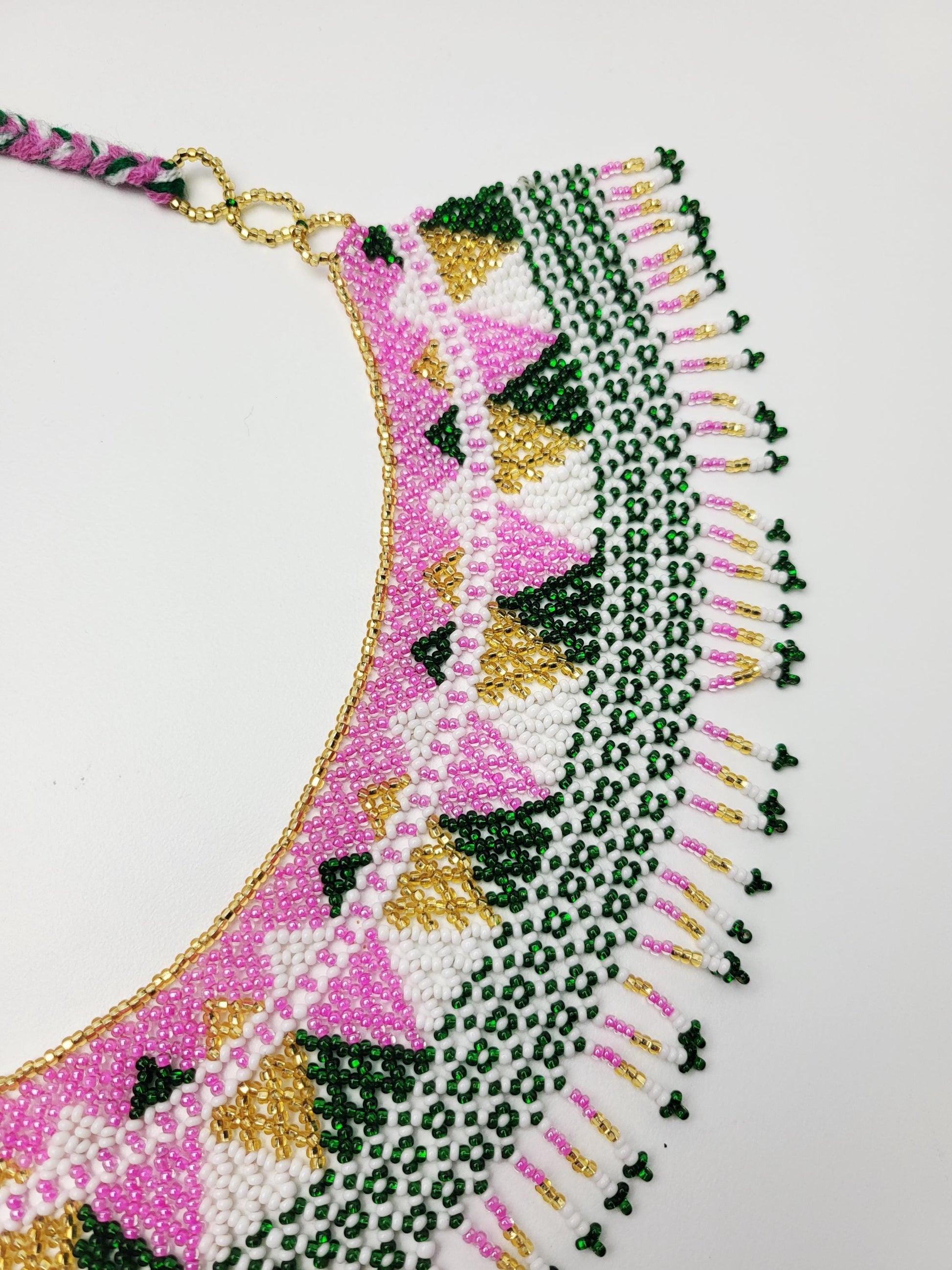 Diese einzigartige Perlenkette verkörpert die lebendige mexikanische Kultur in jedem Detail. Handgefertigt von indigenen Kunsthandwerkerinnen aus Chiapas, entstehen mit hunderten filigranen Glasperlen farbenfrohe Muster, die tief in der Maya-Tradition verwurzelt sind.