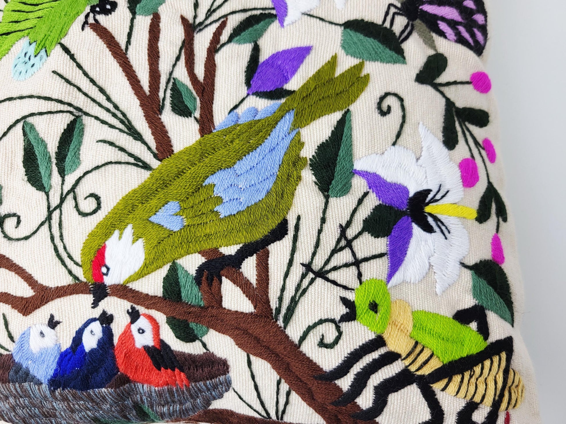 Farbenfroher mexikanischer Kissenbezug mit tropischem Tiermuster. Handgefertigt in Chiapas, Mexiko